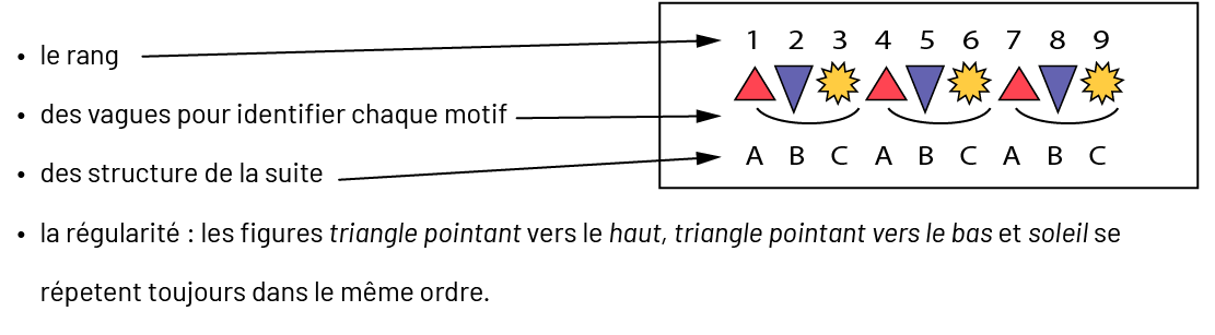 En outre, il est important de demander aux élèves de « lire » la suite en nommant et en touchant chaque élément consécutif du motif pour qu’elles et ils se rendent compte de la répétition.