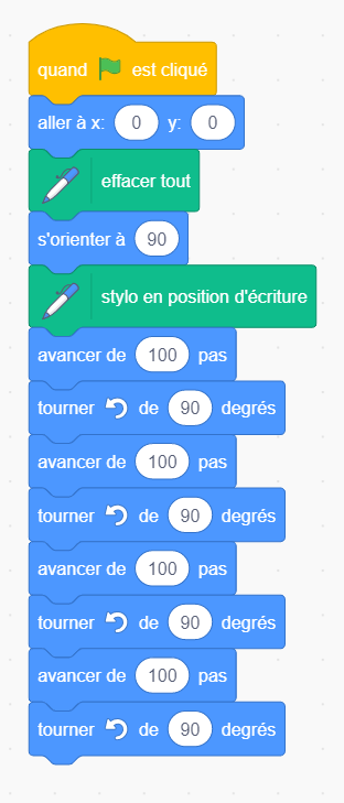 image Blocs de codage attachés les uns dans les autres :Bloc de départ avec le drapeau vert.Bloc de mouvement : aller à « x » zéro et « Y » zéro.Bloc opérateur : effacer tout.Bloc de mouvement : s’orienter à 90.Bloc opérateur : stylo en position d’écriture.8 Blocs de mouvement :Avancer de 100 pas.Tourné de 90 degrés,Avancer de 100 pas.Tourné de 90 degrés.Avancer de 100 pas.Tourné de 90 degrés. Avancer de 100 pas.Tourné de 90 degrés.
