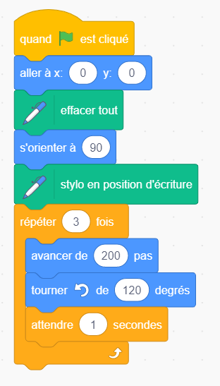 image Blocs de codage attachés les uns avec les autres.Bloc de départ drapeau vert.Bloc de mouvement : aller à « x » zéro et « y » zéro.Bloc opérateur : effacer tout.Bloc de mouvement s’orienter à 90 degrés.Bloc opérateur : stylo en position d’écriture.Bloc de contrôle : répéter 3 fois et recommencer quand la série est terminée.Bloc de mouvement avancer de 200 pas.Bloc de mouvement : tourner de 120 degrés.Bloc de contrôle attendre une seconde.