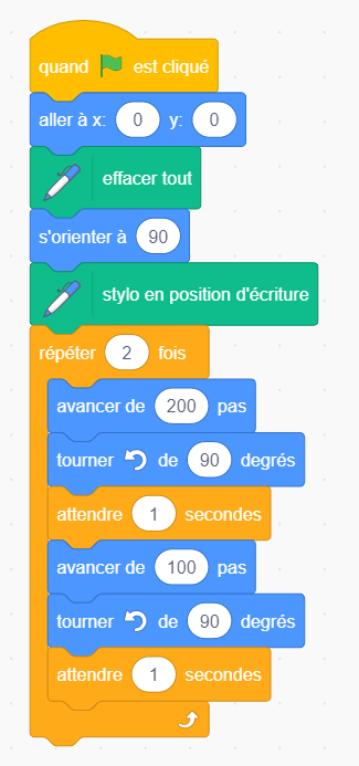 image Blocs de codage attachés les uns avec les autres.Bloc de départ drapeau vert.Bloc de mouvement : aller à « x » zéro et « y » zéro.Bloc opérateur : effacer tout.Bloc de mouvement s’orienter à 90 degrés.Bloc opérateur : stylo en position d’écriture.Bloc de contrôle : répéter 2 fois et recommencer quand la série est terminée.Bloc de mouvement avancer de 200 pas.Bloc de mouvement : tourner de 90 degrés.Bloc de contrôle attendre une seconde.Bloc de mouvement : avancer de 100 pas.Bloc de mouvement : tourner de 90 degrés.Bloc de contrôle : attendre une seconde.