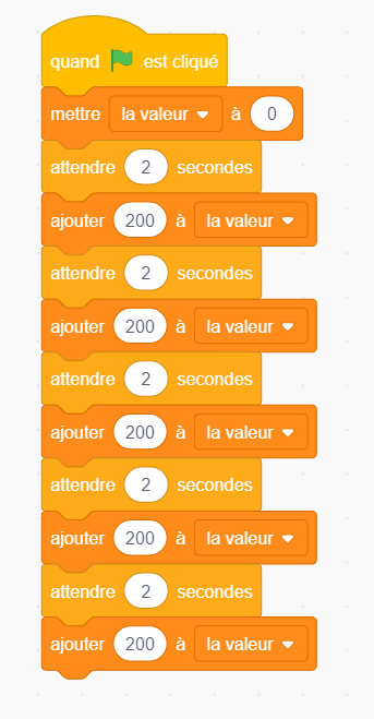 image Blocs de codage attachés les uns avec les autres.Bloc de départ : drapeau vert.Bloc variable : mettre la valeur à zéro.Bloc de contrôle : attendre 2 secondes.Bloc de variable : ajouter 200 à la valeur.Bloc de contrôle : attendre 2 secondes.Bloc de variable : ajouter 200 pas à la valeur.Bloc de contrôle : attendre 2 secondes.Bloc de variable : ajouter 200 à la valeur.Bloc de contrôle : attendre 2 secondes.Bloc de variable : ajouter 200 à la valeur.Bloc de contrôle : attendre 2 secondes.Bloc de variable : ajouter 200 à la valeur.