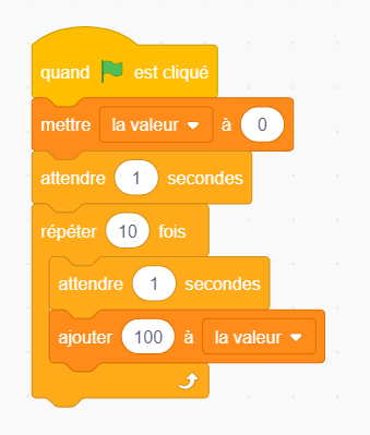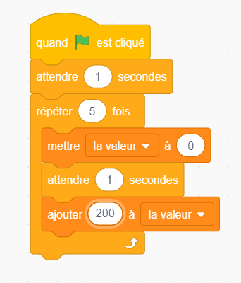 image Bloc sde codage attachés les uns avec les autres.Bloc de départ : drapeau vert.Bloc de contrôle : attendre une seconde.Bloc de contrôle répéter 5 fois.Bloc variable : mettre la valeur à zéro.Bloc de contrôle : attendre une seconde.Bloc de variable : ajouter 200 à la valeur.