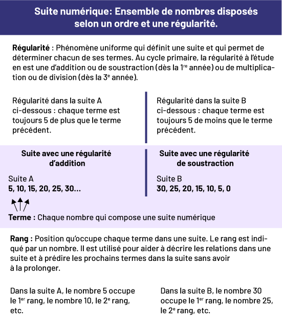 image Suite numérique : ensemble de nombres disposés salon un ordre et une régularité.Régularité : Phénomène uniforme qui définit une suite qui permet de déterminer chacun de ces termes. Au cycle primaire, la régularité à l’étude en est d’addition ou de soustraction d`s la première année ou de la multiplication ou de division dès la troisième année.Régularité dans la suite « A » ci-dessous : chaque terme est toujours 5 de plus que le terme précédent. Suite avec une régularité d’addition :Suite « A » 5, dix, 15, 20, 25, 30…Chaque nombre est un terme.Régularité dans la suite « B » ci-dessous : chaque terme est toujours 5 de moins que le terme précédent.Suite avec une régularité de soustraction.Suite « B », 30,25,20,15, dix,5 zéro.Rang : Position qu’occupe chaque terme dans une suite. Le rang est indiqué par un nombre. Il est utilisé pour aider à décrire les relations dans une suite et à redire les prochains termes dans la suite sans avoir à la prolonger.Dans la suite « A », le nombre 5 occupe le premier rang, le nombre dix, le deuxième rang, etc…Dans la suite « B » le nombre 30 occupe le premier rang, le nombre 25 le deuxième rang, etc…