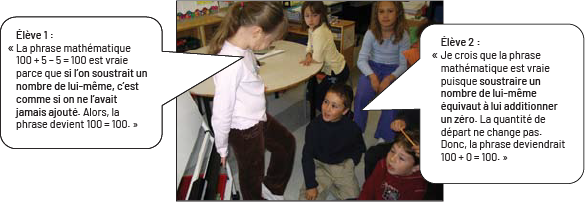 élèves négocient leur raisonnement mathématique. « Élève un » dit « La phrase mathématique cent plus 5 moins 5 égale