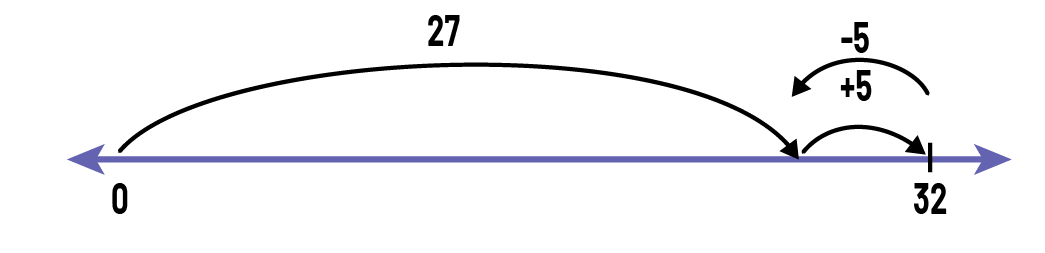 droite numérique allant de zéro à 32. Une flèche va de zéro à 27. Une seconde flèche est marquée « plus cinq », elle