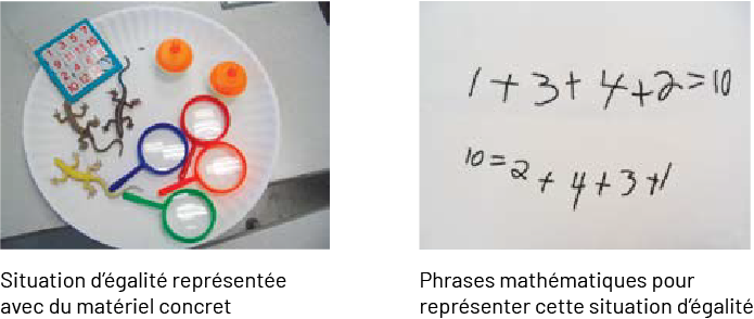 image Image, sous-titrée, « Situation d`égalité représentée avec du matériel concret. » Dans une assiette il y a un jeu, 3 reptiles en plastique, 4 loupes et 2 balles. » Image sous-titrée : « Phrases mathématiques pour représenter cette situation d’égalité. » Elle se lit comme suit : un plus 3, plus 4, plus 2 égale dix.Puis : dix égale 2, plus 4, plus 3, plus un.