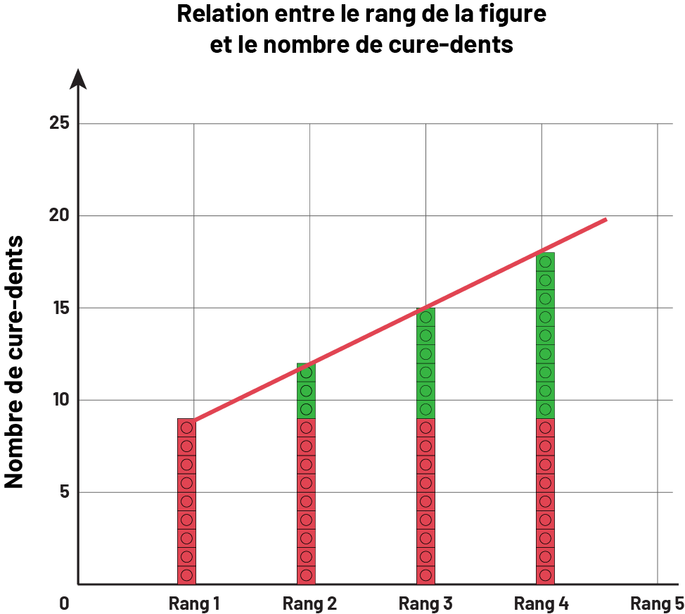 Les suites croissantes peuvent servir d’introduction aux représentations graphiques. Le rang des figures, dans les suites croissantes, correspond aux valeurs sur l’axe horizontal. Le nombre total de termes de chaque figure est représenté par les valeurs sur l’axe vertical. L’axe vertical représente aussi le nombre de termes qu’il y a au rang 0 (la valeur de la constante), qui est l’ordonnée de la représentation graphique.