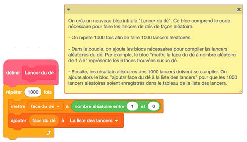 image Un bloc de texte avec une note autocollante correspondante. La note correspond à un bloc variable marqué « définir » « Lancer du de » dans une case légèrement plus foncée. La note autocollante correspondante se lit comme suit : « Nous créons un nouveau bloc nommé « Lancer du dé ». Ce bloc comprend le code nécessaire pour effectuer les lancers du dé de manière aléatoire. - On répète mille fois pour faire 1000 lancers aléatoires. - Dans la boucle, on ajoute les blocs nécessaires pour compiler les lancers aléatoires du dé. Par exemple, le bloc « mettre la face du dé à nombre aléatoire de « un » à six » représente les 6 faces trouvées sur un dé.- Ensuite, les résultats aléatoires des 1000 lancers doivent se compiler. On ajoute alors le bloc « ajouter face du dé à la liste des lancers » pour que les mille lancers aléatoires soient enregistrés dans le tableau de la liste des lanceurs.