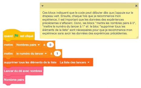 image Un bloc de texte avec une note autocollante correspondante. La note correspond à un bloc de contrôle qui montre « quand » un drapeau vert « est cliqué ». La note autocollante correspondante se lit comme suit : ces blocs indiquent que le code peut débuter dès que j’appuie sur le drapeau vert. Ensuite, chaque fois que je recommence mon expérience, il est important que les données des expériences précédentes s’effacent. Donc, les blocs « mettre les nombres pairs à zéro”, “mettre le numéro du lancer à un” et le bloc “supprimer tous les éléments de la liste » sont nécessaires pour que je recommence mon expérience sans avoir les données des expériences précédentes.