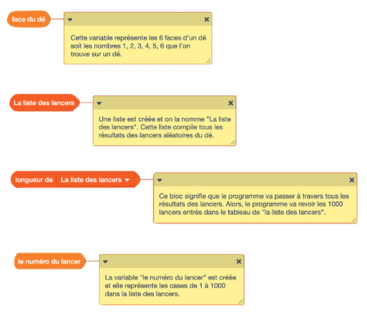 image Quatre variables avec les notes autocollantes correspondantes. La première variable est « face du dé ». La note autocollante correspondante se lit comme suit « Cette variable représente les 6 faces d’un dé soit les nombres, « un », 2, 3, 4, 5, 6 que l’on trouve sur un dé. La variable suivante est « La liste des lancers ». La note autocollante correspondante se lit comme suit « Une liste est créée et on la nomme « La liste des lancers ». Cette liste compile tous les résultats dans lancers aléatoires du dé. La variable suivante est: « « longueur de » « La liste des lancers » ainsi qu'une flèche descendante. La note autocollante correspondante se lit comme suit: « ce bloc signifie que le programme va passer à travers tous les résultats des lancers. Alors, le programme va revoir les mille lancers entrés dans le tableau de « la liste des lancers ». La dernière variable est: « le numéro du lancer ». La note autocollante correspondante se lit comme suit: « La variable “le numéro du lancer” est créée et elle représente les cases de « un » à mille dans la liste des lancers. »