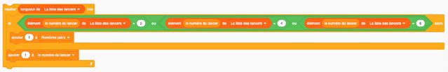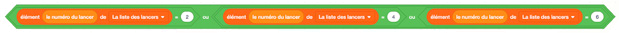 Une séquence conditionnelle, elle contient deux variables marquées « élément » puis « le numéro du lanceur » dans une bulle « de » « La liste des lanceurs » avec une flèche descendante égale « 2, 4, 6 » dans une bulle.image Une séquence conditionnelle, elle contient deux variables marquées « élément » puis « le numéro du lanceur » dans une bulle « de » « La liste des lanceurs » avec une flèche descendante égale « 2 » dans une bulle « ou », ensuite, « élément » puis « le numéro du lanceur » dans une bulle « de » « La liste des lancers » avec une flèche descendante égale « 4 » dans une bulle « ou », finalement, « élément » alors « le numéro du lancer » dans une bulle « de » « La liste des lancers » avec une flèche descendante égale « 6 » dans une bulle.