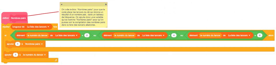 image Un bloc de code et une note autocollante indiquant la section correspondante. Le code commence par un bloc portant la mention « définir » et, à côté, la mention « Nombres pairs » dans une forme ombrée légèrement plus foncée. La note autocollante correspondante indique « On crée le bloc “Nombres pairs” pour que le code place les lancers du dé qui donne un résultat d’un nombre pair, dans un tableau de fréquence. On ajoute donc une variable qui se nomme « Nombres pairs » pour qu’on puisse voir la compilation des nombres pairs dans la liste des lancers aléatoires.