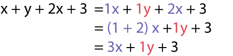 x » plus « y » plus 2 « x » plus 3 égal un « x » plus un « Y » plus 2 « x » plus 3. Égal (parenthèse ouvrante) un plus
