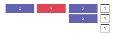 Première ligne : bloc « x », bloc « y », bloc « x » un carré noté un.Deuxième ligne : un bloc « x », un carré noté un.