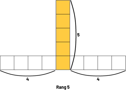 D’après les premières figures de la suite, le nombre de carrés dans la colonne est égal au rang de la figure et le nombre de carrés à gauche et à droite est toujours 1 de moins que ce rang.
