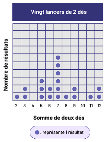 est Vingt lancers de 2 dés. Titre de l’axe vertical : Nombre de résultatsTitre de l’axe horizontal : Somme