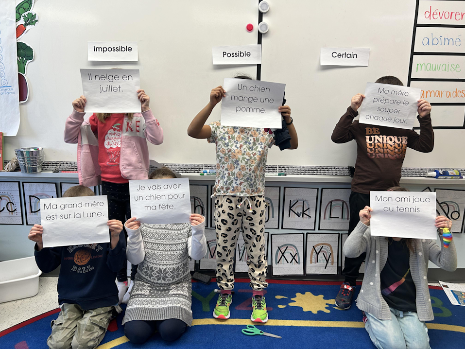 Dans une salle de classe, six élèves se tiennent sous une des trois étiquettes, soit Impossible, Possible et Certain. Chaque élève tient, devant son visage, une affiche présentant un énoncé impossible, possible ou certain.Étiquette Impossible :Il neige en juillet.Ma grand-mère est sur la lune. Je vais avoir un chien pour ma fête.Étiquette Possible :Un chien mange une pomme.Étiquette Certain :Ma mère prépare le souper chaque jour.Mon ami joue au tennis.
