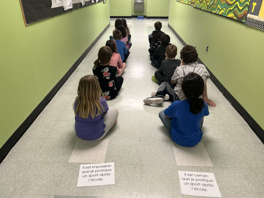 Deux groupes d’élèves assises et assis les unes et les uns derrière les autres, en deux colonnes, selon deux énoncés : « Il est impossible que je pratique un sport après l’école. » et « Il est certain que je pratique un sport après l’école. »