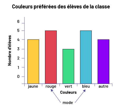 Image Le diagramme à 5 bandes colorées s’intitule : « Couleurs préférées des élèves de la classe ». L’axe horizontal se nomme « Couleurs », tandis que l’axe vertical se nomme « Nombre d’élèves ». La bande jaune s’élève jusqu’au chiffre 4. La bande rouge s’élève jusqu’au chiffre 5. La bande verte s’élève jusqu’au chiffre 3. La bande bleue s’élève jusqu’au chiffre 5, et la bande pourpre qui signifie « Autres » s’élève jusqu’au chiffre 4. Avec des flèches, le mot « mode » pointe la bande rouge et la bande bleue.