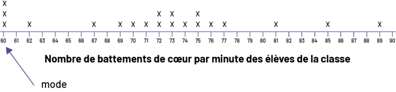 Image La ligne de dénombrement s’intitule « Nombre de battements de cœur par minute des élèves de la classe ». Elle est graduée de 60 à 90. Avec une flèche, le mot « mode » pointe le nombre 60. Les nombres qui ne possèdent aucun X sont : 61, 63, 64, 65, 66, 68, 78, 79, 80, 82, 83, 84, 86, 87, 88, et 90. Les nombres 62, 67, 69, 70, 71, 74, 76, 77, 81, 85 et 89 possèdent un X. Les nombres 72, 73 et 64 possèdent deux X. Le nombre 60 possède trois X.