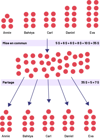 On met d’abord les montants d’argent en commun pour constater qu’il y a 35 $ en tout. Cela correspond à l’opération 5 $ + 6 $ + 6 $ + 8 $ + 10 $ = 35 $. La somme est ensuite partagée équitablement et chacun reçoit 7 $, ce qui correspond à l’opération 35 $ ÷ 5 = 7 $.