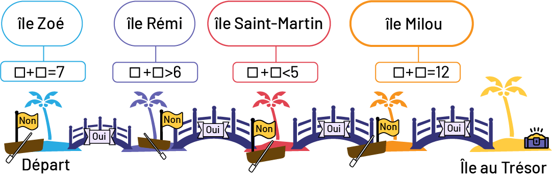 Image Cinq mini îles de différentes couleurs sont alignées côte à côte. Elles sont toutes reliées par des ponts sur lesquels il est écrit « oui ». Elles hébergent chacune une barque dont le drapeau hissé sur le mât indique « non ». L'île de départ, l’île zoé, est bleue et présente l’équation suivante : carré vide plus égale 7. la deuxième, rémi, violette grand que 6. troisième, saint-martin, rouge petit cinq. quatrième, milou, orange 12. elle mène à dernière île, au trésor, qui jaune.