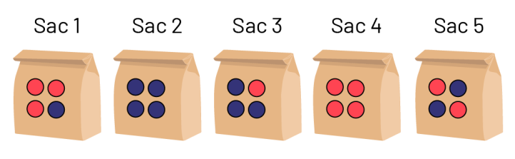 Image Cinq sacs en papier s’alignent côte à côte. Chacun d’eux contient quatre billes. Le sac un contient trois billes rouges et une bille violette. Le sac deux contient quatre billes violettes. Le sac trois contient une bille rouge et trois billes violettes. Le sac 4 contient 4 billes rouges. Et le sac cinq contient deux billes rouges et deux billes violettes.
