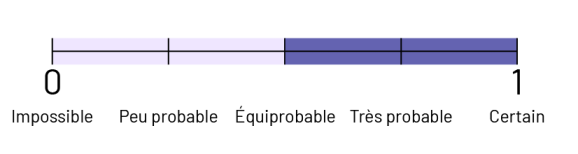 Image L’échelle des probabilités est graduée de zéro à un et sectionnée en quatre parties. À l’extrême-gauche, à zéro, il est écrit « impossible ». Au premier quart, il est écrit « peu probable ». À la moitié, il est écrit « équiprobable ». Au troisième quart, il est écrit « très probable ». Et à l’extrême-droite, à un, il est écrit « certain ». La première moitié de la ligne est violet pâle tandis que la deuxième moitié est violet foncé.