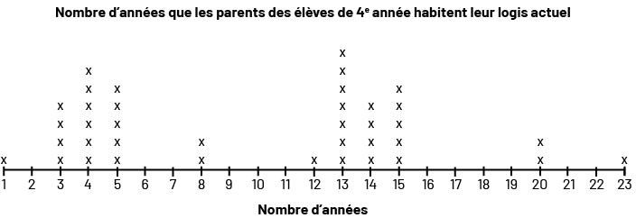 Le personnel enseignant demande à ses élèves de vérifier le nombre d’années que leurs parents demeurent dans le logis actuel. Les résultats sont représentés par la ligne de dénombrement suivante.
