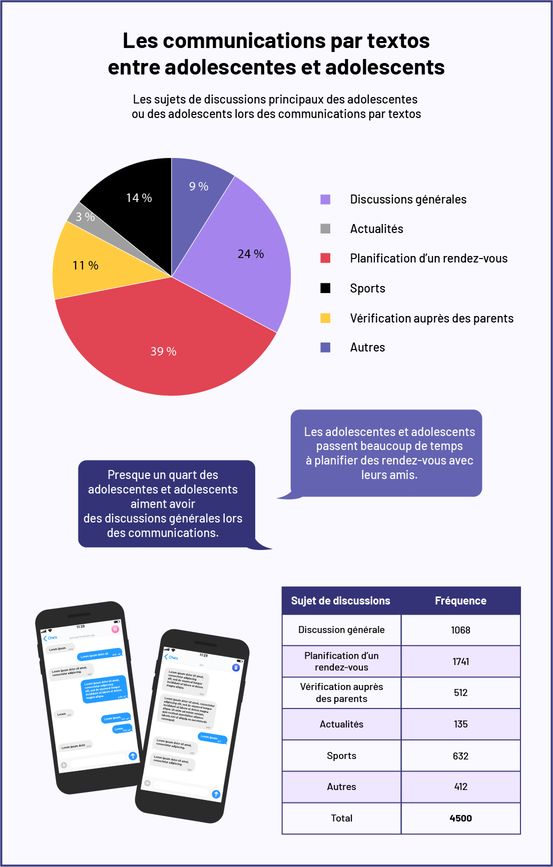 Image Titre de l’infographie : Les communications par textos entre adolescentes et adolescents. Un diagramme circulaire coloré s’intitule : « Les sujets de discussions principaux des adolescentes ou des adolescents lors des communications par texto. » Le sujet « Discussions générales » représente 24 pourcent du cercle. Les actualités représentent 3 pourcent du cercle. La planification d’un rendez-vous représente 39 pourcent. Les sports représentent 14 pourcent. La vérification auprès des parents représente 11 pourcent. Et « Autres » représente cinq pourcent. Un phylactère violet foncé contient le texte suivant : « Presque un quart des adolescentes et adolescents aiment avoir des discussions générales lors des communications. » Un phylactère violet plus pâle contient le texte suivant : « Les adolescentes et adolescents passent beaucoup de temps à planifier des rendez-vous avec leurs amis. ». À côté de l’image de deux téléphones affichant une conversation par messagerie, il y a un tableau à deux colonnes. La première se nomme « Sujets de discussions » et la deuxième se nomme « Fréquences ». Pour discussions générales, la fréquence est de 1068. Pour la planification d’un rendez-vous, la fréquence est de 1741. Pour la vérification auprès des parents, la fréquence est de 512. Pour les actualités, la fréquence est de 135. Pour les sports, la fréquence est de 632. Et pour les autres sujets, la fréquence est de 412. Le total des fréquences est de 4 500.