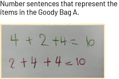 Ask a student to present one of their number sentences corresponding to the contents of the Goody Bag A and to explain the meaning of the symbols; for example, in the number sentence 4 + 4 + 2 = 10: