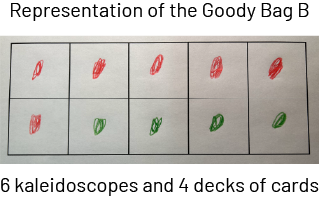 - two goody bags containing 10 elements each (the first bag containing three different types of elements and the second containing two different types of elements)