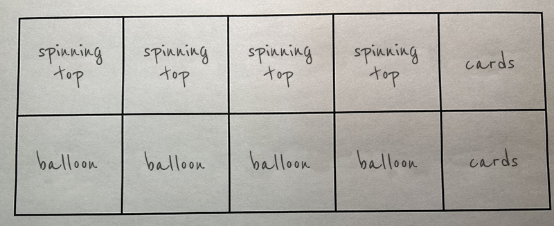 4 spinning tops, 4 balloons and 2 decks of cards