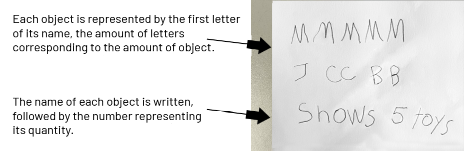 Invite students to present and explain their representations, whether they are conventional or not; for example, one student indicates that they have chosen to represent the four spinning tops with the letter “D”, since it is the fourth letter of the alphabet. Support this student to understand the ineffectiveness of the representation by asking them to explain how one could symbolize the four balloons.