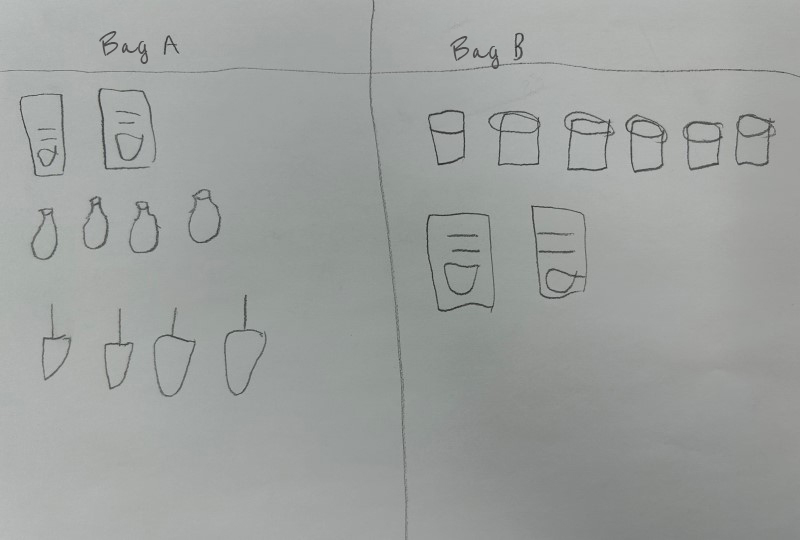 Ask students to represent the contents of each goody bag in different ways. If they choose to draw the objects to represent them, emphasize that it is not necessary to focus on the exact representation of objects.