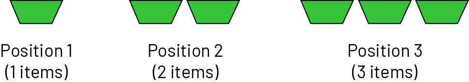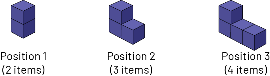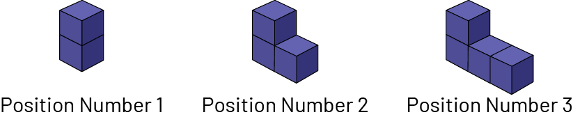 | In Pattern A, the blue rectangle is in position 1, the green trapezoid is in position 2, the orange triangle is in position 3, etc. | In Pattern B, one square is in Position 1 and in Pattern C, two cubes are in Position 1. |