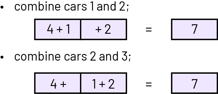 Note: Students who are familiar with the commutative property, might change the order of the terms to be added (for example, 4 + 2 + 1). If so, ask them to justify why the order can be changed. Otherwise, simply mention that the order of the cars cannot be changed, since they are attached to the track in this way.