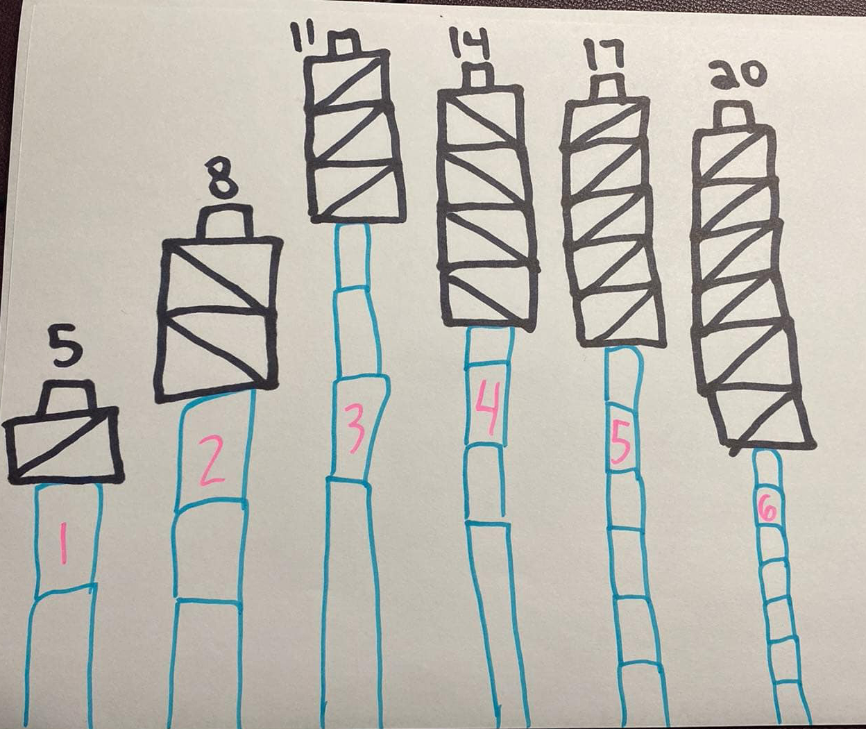 Ask questions of students who have clearly indicated what the numbers represent on their drawings (the number of pattern blocks or the age of the tree). For example: