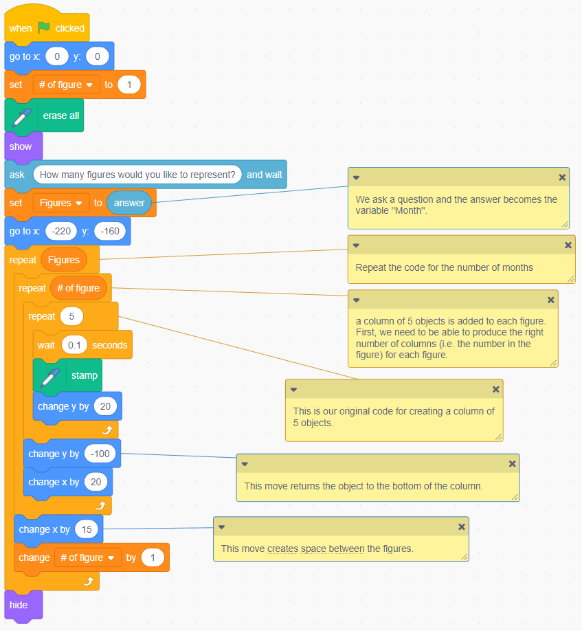 Image Blocks of code: Events block stating “start on when green flag is clicked”.” Variables block stating “set number of shapes columns to ‘1’.” Pen extension stating “erase all”. Looks block stating “show”. Sensing block stating “ask ‘how many sets of shapes you would like to show’ and wait.” Variables block stating “set sets of shapes to motions block stating “answer”.” Caption: “The question is aksed and the answer becomes the variable ‘shapes’.” Motions block stating “go to x: ‘-220’ y ‘-150’. Caption: “This code blocks will be repeated ‘shapes’ times. Controls block stating “repeat” variables block stating “shapes’. “ Insider 3 nested blocks. Controls block stating “shape numbers.” Caption: For each shape, a column of 5 objects is added. We must be able to produce the correct number of columns. (that is , the ‘shape number) for each number. Inside 4 nested blocks. Controls block stating “repeat 5”. Caption: “This is the original code that creates a column of 5 shapes”. Controls block stating “wait ‘0.1’ seconds. “ Pen extension stating “stamp” Motions block stating “change y by ‘20’. Motions block stating “change y by ‘-100’.” Caption: “This returns the object (the srpite) to the base of the column.” Motions block stating “change x by ‘20’.” Motions block stating “change x by ‘15’.” Caption: “This dosplacement creates a space between the group of shapes” Variables block stating “change number of shape by ‘1’.” Looks block stating “hide”. |