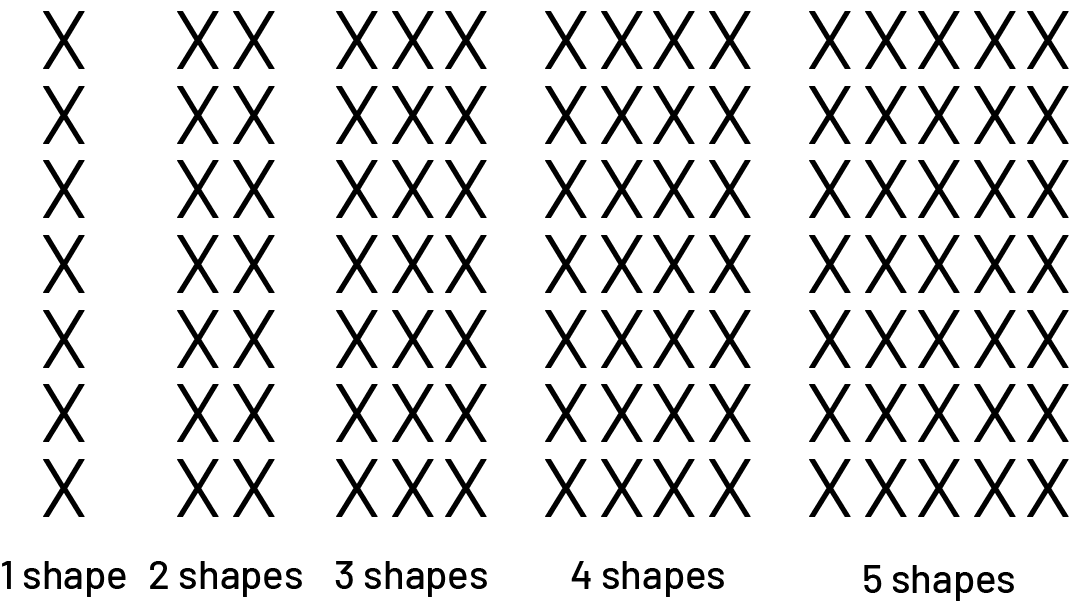 Image Graphic representation of the amount of each shape « s » and the number of tabs « n ». shape one: 7 tabs. shape 2: 14 tabs. shape 3: 21 tabs. shape 4: 28 tabs. shape 5: 35 tabs.