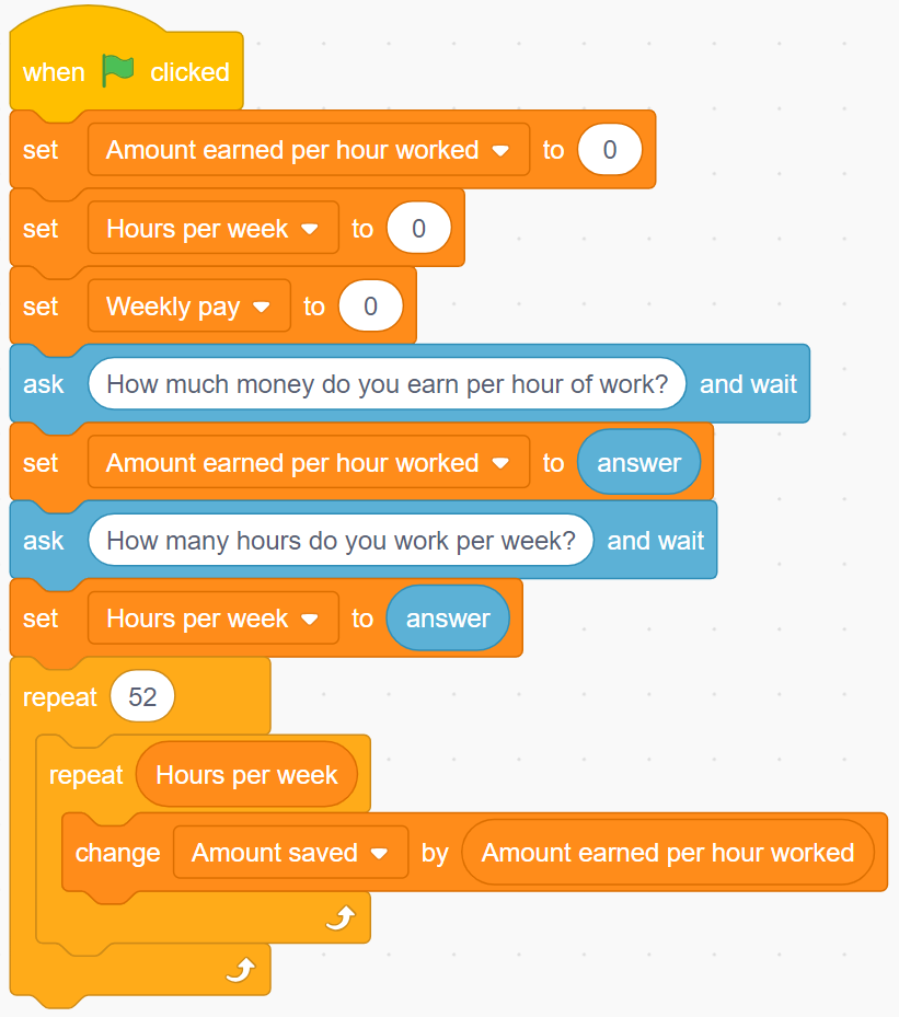 Image Blocks of code: Events block stating “start on when green flag is clicked”. Variables block stating “set amount earned per hour worked to ‘0’.” Variables block stating “hours per hour worked to ‘0’.” Variables block stating “weekly pay to ‘0’.” Sensing block stating “ask ‘how much money do you earn per hour of work?’ and wait”. Variables block stating “set amount earned per hour worked to motions block stating “answer ‘0’.” Sensing block stating “’how many hours do you work per week?’ and whit”. Variables block stating “set hours per week to motions block stating “answer”. Controls block stating “repeat 52”. Inside 2 nesting blocks. Controls block stating “repeat” variable block “hours per week”. Variable block “change amount saved by the amount earned per hours worked.” |