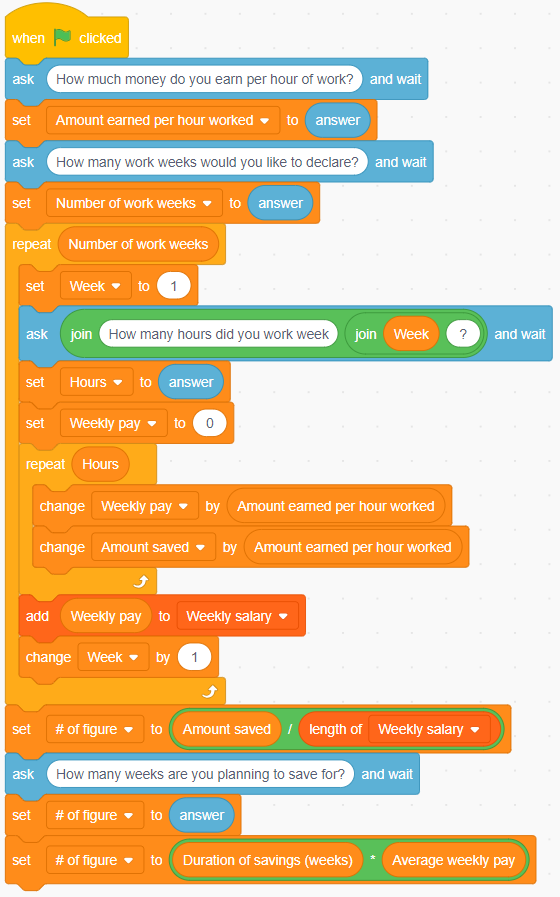 Image Blocks of code: Events block stating “start on when green flag is clicked”. Sensing block stating ”ask ‘how much money do you earn per hour of work?’ and wait”. Variables block stating “set amount earned per hour worked to” Motions block “answer”.” Sensing blocks “how many work weeks would you like to declare?’ and wait”. Variables block stating “numbers of work weeks to” motions block “answer”. Control block stating “repeat” variable block “number of work weeks”. Inside 7 nested blocks. Variables block stating “set week to ‘1’.” Motions block stating “ask how many hours did you work week’ join” variables block stating “week and wait”. Variable block stating “set hours to” motions block stating “answer”. Variable block stating “set weekly pay to ‘0’.” Control block stating “repeat” variable block stating “hours”.” Inside 2 nested blocks. Variable block stating “change weekly pay by amount earned per hour worked.” Variable block stating “change amount saved by amount earned per hour worked.” List block stating “add” variables block stating “weekly pay” list block stating “to weekly salary”.” Variables block stating “change week by ‘1’.” Variables block stating “amount earned per hour worked to ‘0’.” |