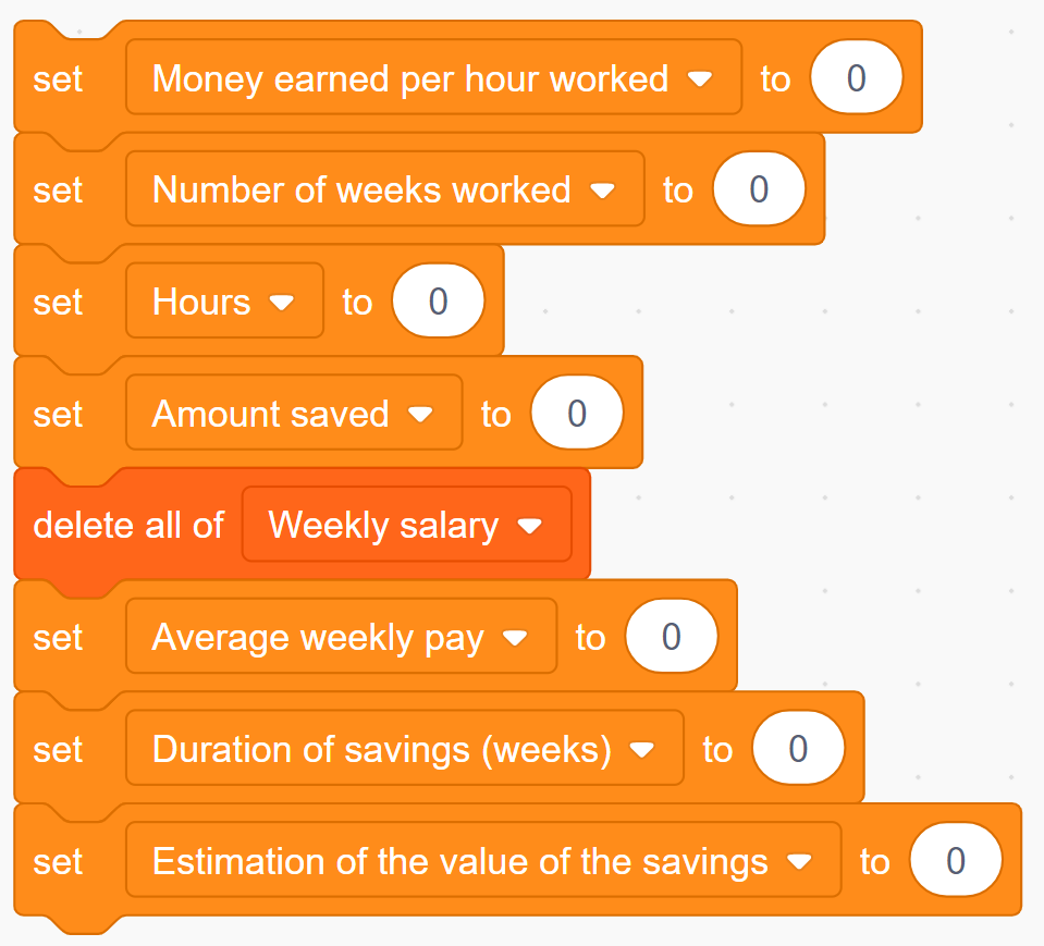 Image Blocks of code: Variables block stating “set money earned per hour worked to ‘0’.” Variables block stating “number of weeks worked to ‘0’.” Variables block stating“hours to ‘0’.” Variables block stating “Amount saved to ‘0’.” List block stating “delete all of weekly salary.” Variables block stating “Average weekly to ‘0’.” Variable block stating “Duration of savings (weeks) to ‘0’.” Variable block stating “estimation of the value of the saving to ‘0’.”