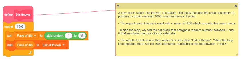 - A block of code to simulate a roll of a six-sided die and compile the results.