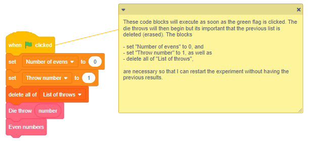 | The student repeats 1,000 times in their even number code rather than repeating the length of the list. | Ask the student where the results of the dice rolls are compiled (the results of the dice rolls should be compiled in "The Rolling List").