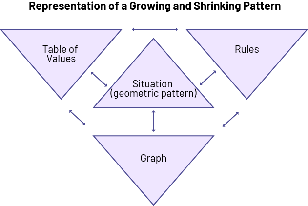 In the junior grades, students explore patterns and represent them in different ways. In Grade 5, students learn that a growing pattern can be represented by a situation (non-numeric pattern), a word rule, a table of values, or a graphical representation. The arrows in the graph below show the connections between these representations.