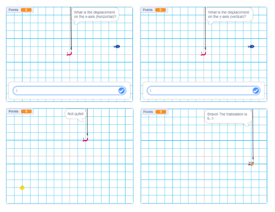 Challenge students to create a game to be shown to a peer. The objective of the game is to test the peer's knowledge of the description of translations in the four quadrants of the Cartesian plane. The game will consist of moving a sprite using translation vectors (coordinates) so that it touches various objects.