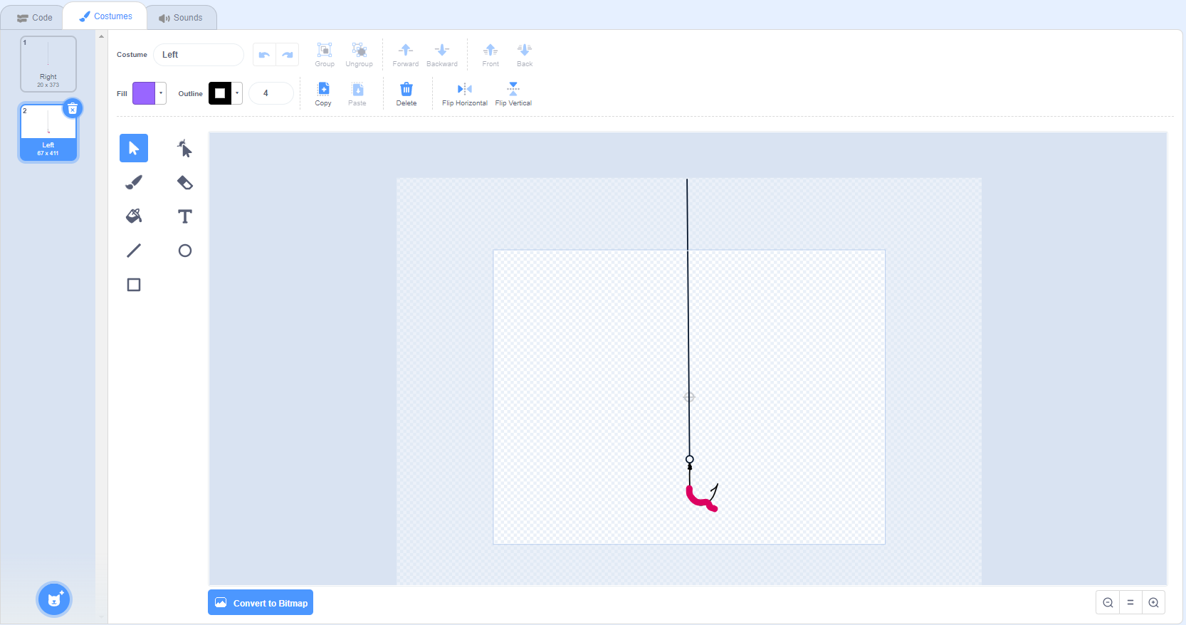 The hook used in the example is drawn by hand. Students can choose existing sprites or create or alter a sprite in the "costumes" menu. |
