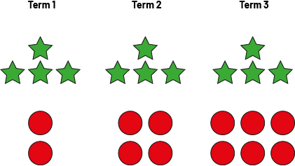 Students may also notice that the number of blue squares, 3, remains constant, while the number of red circles increases by 1 for each term.