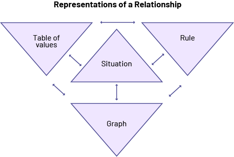 In the junior grades, students explore patterns and represent them in different ways. In Grade 4, students learn that a relationship can be represented by a situation (non-numeric pattern), a word rule, a table of values, or a graphical representation. The arrows in the graph below show the connections between these representations.